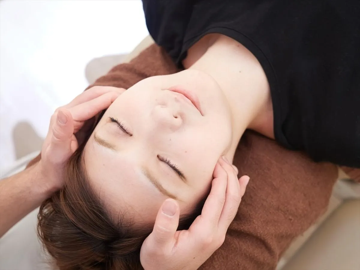 まず、両手の指先をこめかみに添え、心地よい圧をかけながら円を描くようにゆっくりとマッサージを行います。そのまま耳の上部に指を移動し、同様に側頭部を優しくマッサージします。このとき、頭皮を撫でるのではなく、皮膚の下の筋肉を意識して動かすことがポイントです。最終的には頭頂部に向けて指を移動しながら全体をほぐすことで、目元から頭全体にかけての血流が改善され、緊張がリリースされていきます。